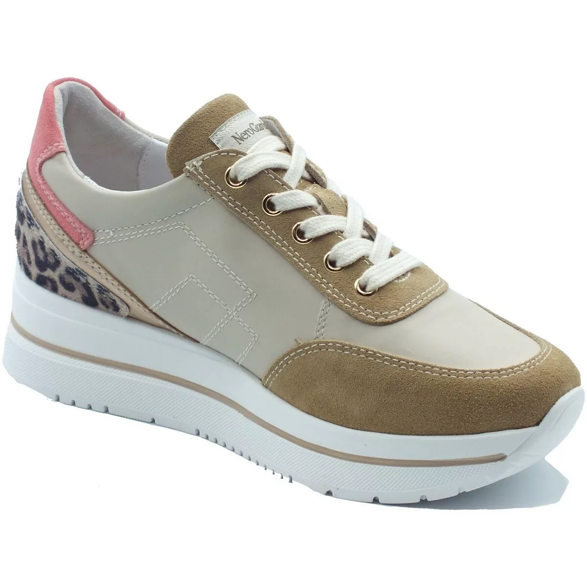 Les baskets beiges compensées NeroGiardini allient élégance et confort au quotidien. Conçues entièrement en cuir, elles offrent un excellent maintien et une belle tenue dans le temps. Le talon compensé de ces baskets apporte une touche féminine tout en restant confortable, idéale pour élancer la silhouette sans sacrifier le bien-être. Pratiques à enfiler grâce à leur fermeture éclair, ces baskets beiges compensées NeroGiardini se distinguent par des détails tendance : un arrière au motif léopard qui apporte du caractère et du cuir rose pour une note délicatement originale. Faciles à associer, elles complètent aussi bien une tenue casual qu’un look plus habillé. Un modèle chic et moderne, parfait pour celles qui recherchent des baskets compensées en cuir, confortables et stylées.