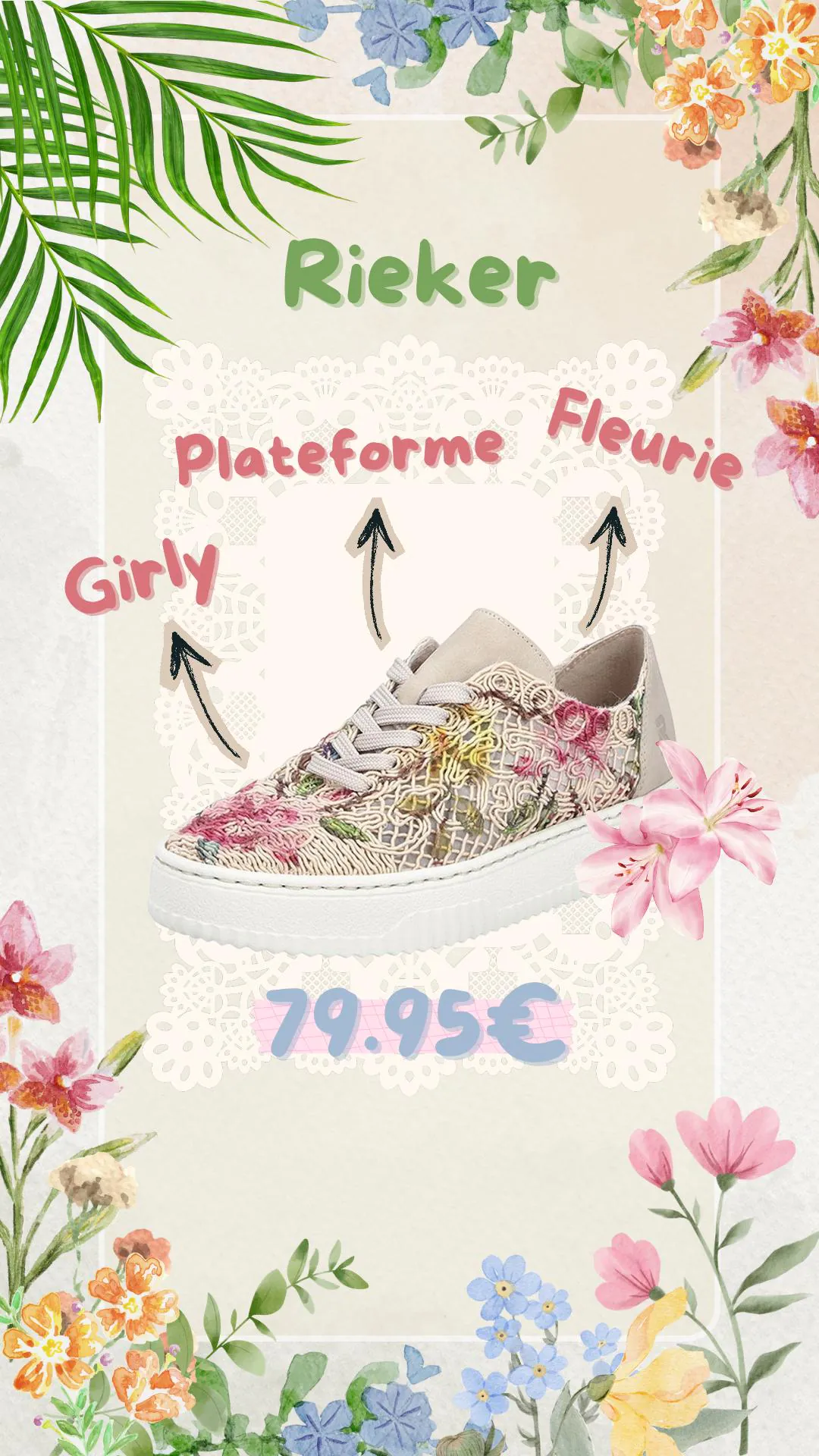 Ces baskets à plateforme Rieker séduisent par leur design original et tendance. Son mélange de matières avec une broderie multicolore apporte une touche unique et moderne, idéale pour dynamiser une tenue du quotidien. Montée sur une semelle épaisse blanche, cette basket pour femme, assure un bon confort tout en offrant une allure urbaine et féminine. Facile à associer, cette chaussure Rieker est parfaite pour un look casual chic, en ville comme au travail.
