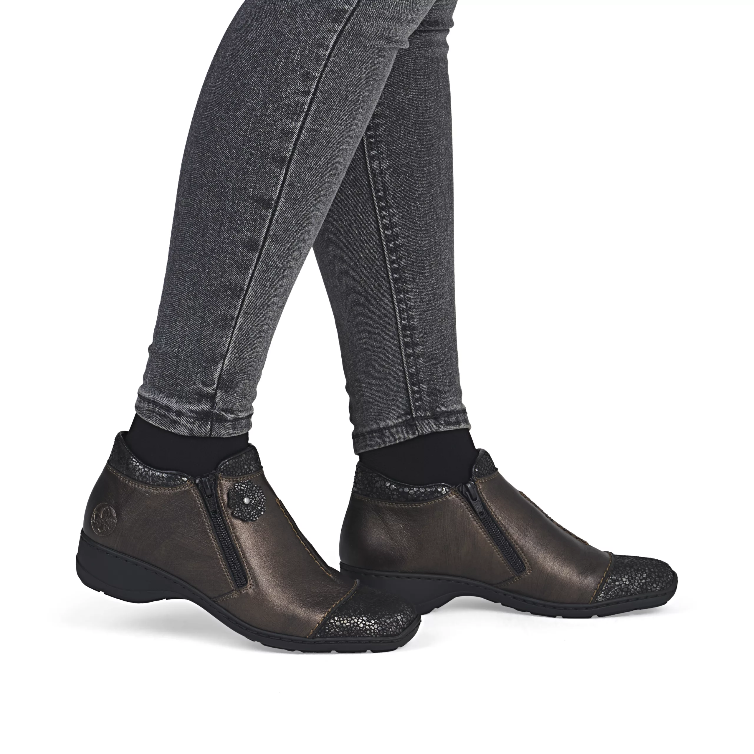 Ces bottillons bronze de la marque Rieker sont souples, confortables et très légers. Ces bottillons pour femme sont conçus en cuir imprimé et doublés de textile doux. Vous aimerez ce modèle facile à enfiler, qui se ferme par un double zip. Les personnes qui portent des semelles orthopédiques seront enchantées par ces chaussures avec semelles amovibles de la marque Rieker !