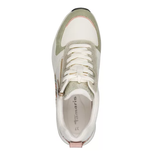 Ces baskets blanches et vertes compensées Tamaris vous accompagneront toute la saison. Les personnes qui portent des semelles orthopédiques seront enchantées par ces chaussures avec semelles amovibles de la marque Tamaris ! Par souci pratique ce modèle intègre à la fois un laçage à l’avant et une fermeture éclair sur le côté. Ces baskets 23754-45 770 sont des chaussures vegan, de quoi ravir les amoureux des animaux.